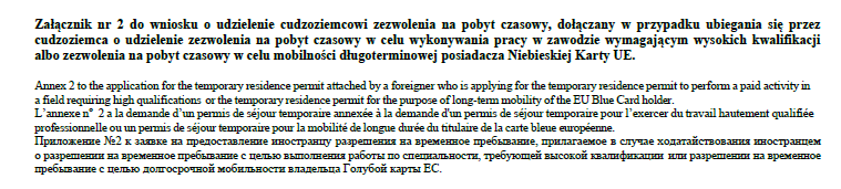 Образец Załącznik nr. 2 к заявлению получение разрешения на временное проживание (для Blue Card).